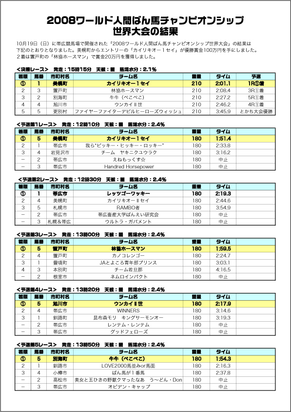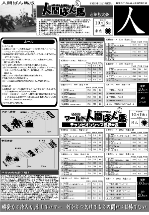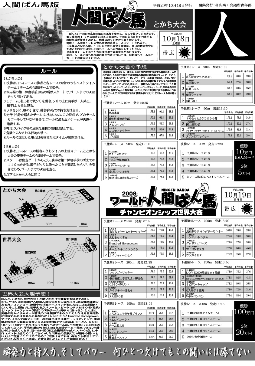 平成20年10月18日(土)19日(日)の2日間、帯広競馬場は多くの来場者で賑わい、第2回ばん馬まつりが盛会のうちに終了しました。 帯広YEGは両日の「人間ばん馬レース」の運営を担当。