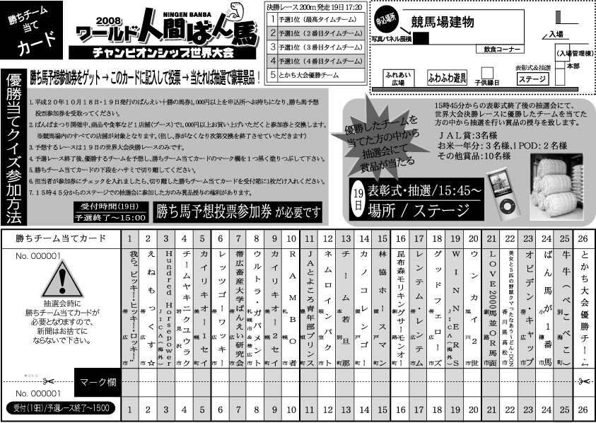 19日の「世界大会」は予想を超える43チームもの申し込みがあり、より多くのチームに優勝賞金100万円を目指してトライしてもらいたいと、予選枠を増やして25チームでの競技となりました。JICA研修生チームをはじめ、遠くは香川県高松市からの出場もあり、世界大会の名に相応しい大会となりました。決勝レースで優勝を競い白熱した接戦を繰り広げたのは、置戸町人間ばん馬で常勝している2チーム。ラストスパートは、見ている側も自然と力が入り、「ガンバレ〜!!」と叫んでしまうほどの感動レースでした。また、世界大会では、「勝ち馬予想抽選会」を実施。JAL賞、お米1年分、iPodなどの景品を用意し、たくさんの来場者にお楽しみいただきました。