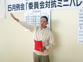 5月18日(日曜日)組織強化委員会担当による5月例会「委員会対抗ミニバレーボール大会」が大江病院体育館にて開催されました。朝9時より例会セレモニーが始まり、木村会長の挨拶では、「YEG活動の原動力は委員会であり、スタートのこの時期にミニバレーを通じて委員会の友情と結束力を育んで欲しい」と挨拶した後、ラジオ体操を行い、AブロックとBブロックにわかれて大会が始まりました。競技はブロック内総当り戦(一試合11点先取ラリーポイント制で2回戦)でブロック内順位を決定させます。そして各ブロックの同じ順位同士が戦います。声援や笑い声、拍手などが響き渡るなか競技が行われすべての委員会の順位が決定致しました。汗をかいた後は、屋外にて美味しい焼肉を囲いながらお酒を飲み更に懇親を深めました。又、ミニバレーの話題で盛り上がるなかで表彰式が行われ、4位「会員交流委員会」3位「ビジネス交流委員会」には商品券と、なぜか?木彫りのナウマン像が進呈され、2位「組織強化委員会」には賞品券と小さい準優勝カップ、1位「総務・広報委員会」には、商品券と特大の優勝カップが進呈されました。角玄委員長が最後にお礼の挨拶をして楽しい一日が終了致しました。