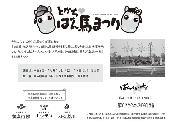 今年も、「2010とかちばん馬まつり」が開催されます! 賞金総額150万円をかけ6人1組で本馬場を滑走する「人間ばん馬大会」をはじめ、 各種アトラクション、タレントによるステージなどなどお楽しみがいっぱい♪ 今年の秋は、帯広の「ばんえい競馬」に足をお運び下さい!