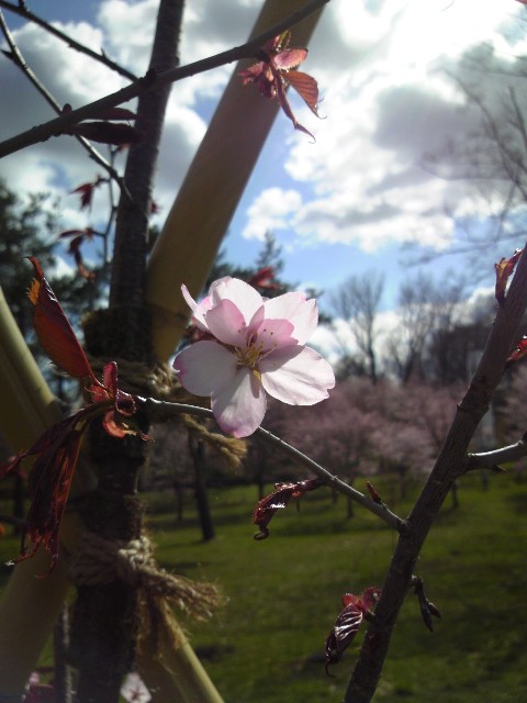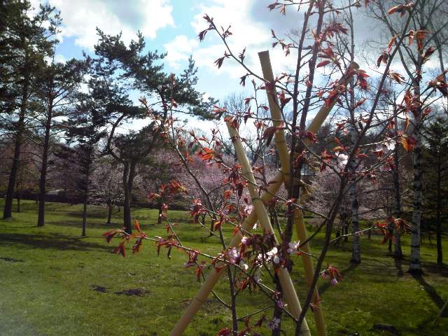 帯広YEG創立20周年記念事業の一環として帯広市に寄与させていただいた10本の桜が立派に花びらを付けはじめました。氷まつりで帯広YEGが運営するジャンボスライダー作製付近に背丈2メートルぐらいの小さなエゾヤマザクラの木が10本あります。周りには大きな桜の木があり、目立つことはありませんが確実に成長してることを実感しました。まだ1本のみの開花ですが5月下旬には10本の桜がたくましく花を咲かせると思います。お近くにお越しの際には是非、ご覧頂けたらと思います。(写真クリックで拡大されます) |