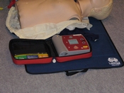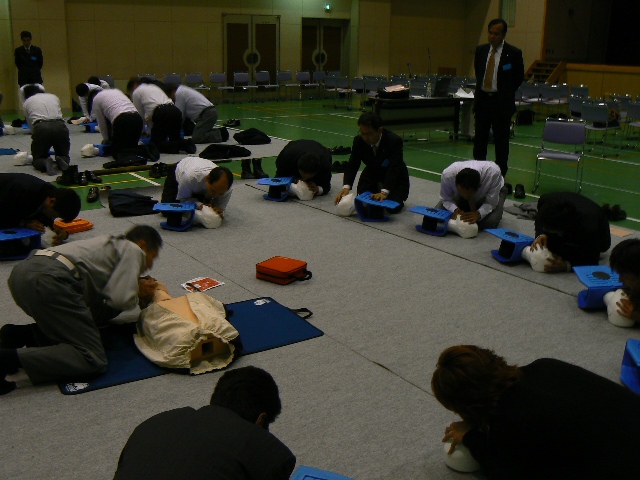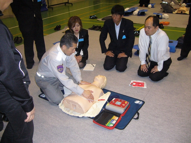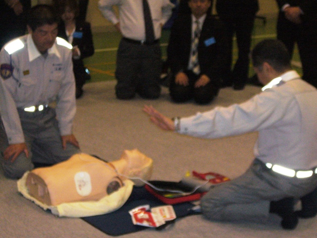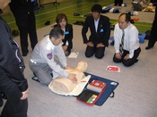 実際に人形を使って救命方とAEDのデモンストレーションをしていただきました。 1、まず交通事故などの場合は、現場が安全か、周囲の確認をします。 メンバーも体験しました。胸を押すときの角度が大切だそうです。まっすぐ上から押さないと肋骨が折れてしまいます。また、心臓の位置は右というより、胸の中央にあるそうです。 |