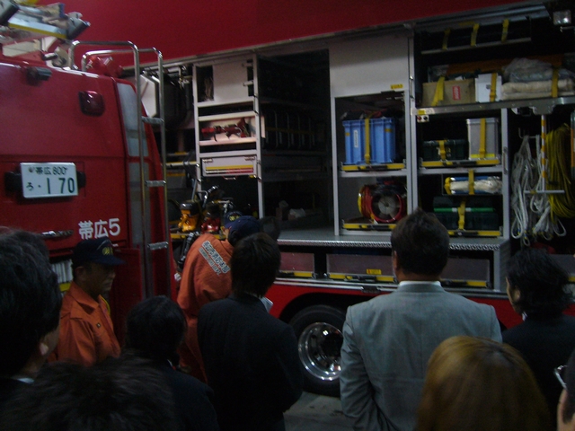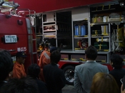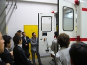 緊急車両の見学。まずは、消防車の説明です。この車両は一番大きく、ディーゼル車で排気量はなんと、20780ccです!中には油圧式のホースや人の顔より大きなカッター、チェンソー、300kgの圧力の空気ボンベ、排煙器などが積んでありました。戸をこじ開けたり、煙を出すために屋根を曲げたりするのに使用します。 |