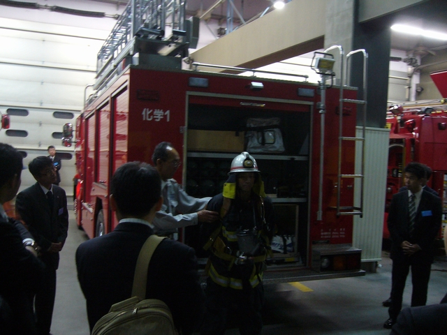 消防車は6台、それぞれに役割がありました。クレーン車の梯子は40m、ビルの10~11階まで届くそうです。1台に積んである600ℓの消火剤(泡)は、水2500ℓ分の消火能力があります。これは、消防車7台分に相当します。また、バッテリーの消費を抑えるため、LEDランプを使用したりと工夫もなされていました。こちらの消防士の方が着ている服装は国際基準に沿ったもので、空気ボンベなどを入れると、20kg弱あるそうです。 |