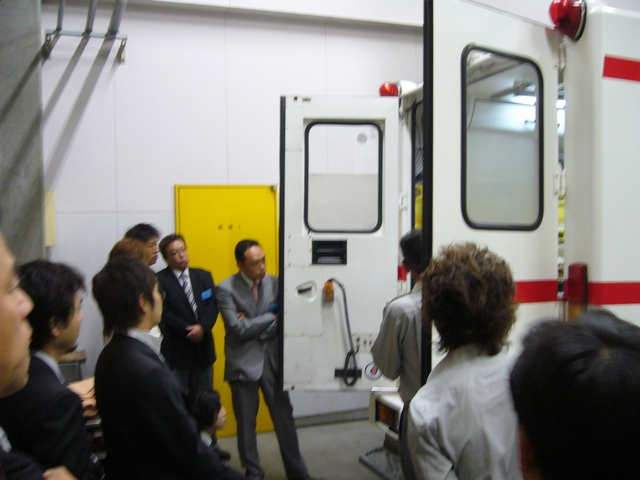 救急車の見学です。救急車に積んである、機材や救命に必要な設備の説明がありました。救急車専用の機材ではなく、実際に病院で使われている機材が装備されていました。血圧や心電図を測る機材、AEDよりさらに精密な機材など。救急車の変換の説明もありました。最近は機材もコンパクトになったので、車両もコンパクトに、そして4WDになったそうです。クラウンハイルーフ→ハイエース→大型車→現在 |