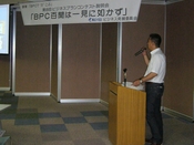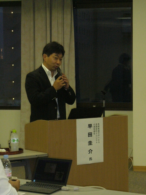 過去2回ビジネスプランコンテストでグランプリに輝いている、長崎県平戸YEGの早田さんを招き、2008,2009年グランプリ受賞のプレゼンをして頂きました。 2008年グランプリ受賞「野菜のり」 2009年グランプリ受賞「YOKAROバス」それぞれのプレゼンを再現して頂きました。またプレゼン終了後には、その後についてもお話していただき、どちらも事業として着実に成果を上げてると報告いただきました。 |