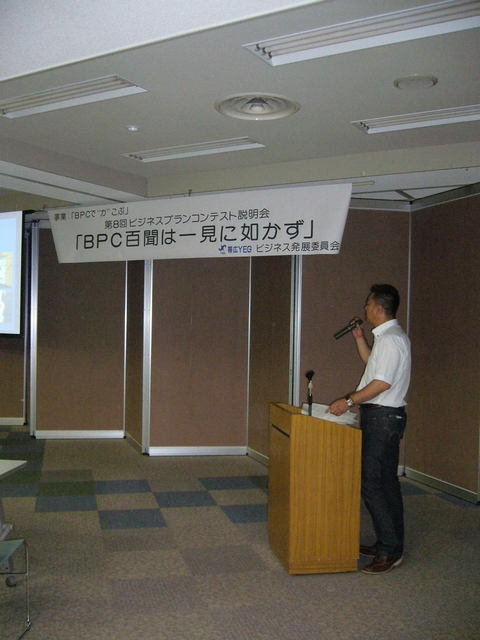 BPCとは「ビジネスプランコンテスト」の略で、日本YEGが今まで7回行っている事業です。今年は第8回目となり、皆さんの各企業のビジネスプランやビジネスモデルを具体化する絶好の機会を与えてもらい、プランやモデルの不足している箇所に指摘指導してもらいながら、より具体化していくものです。 |