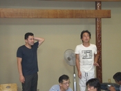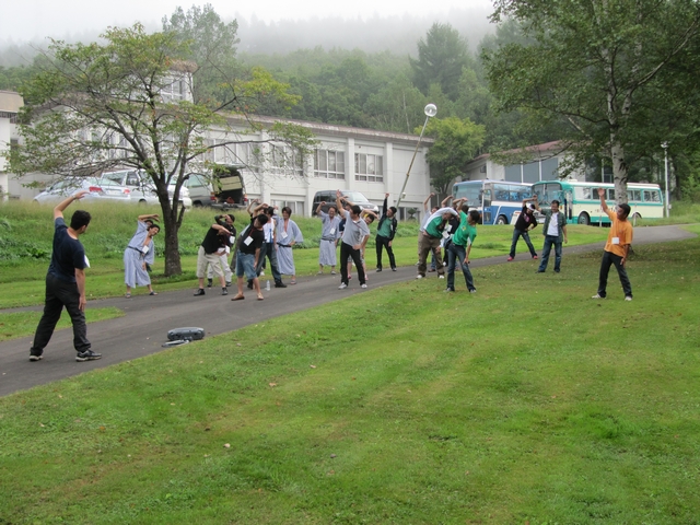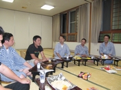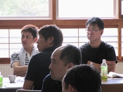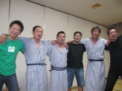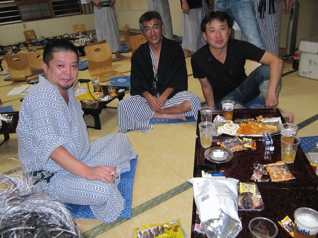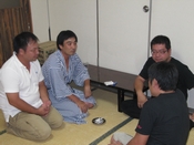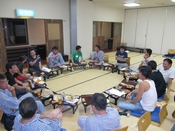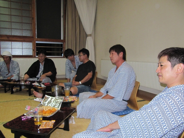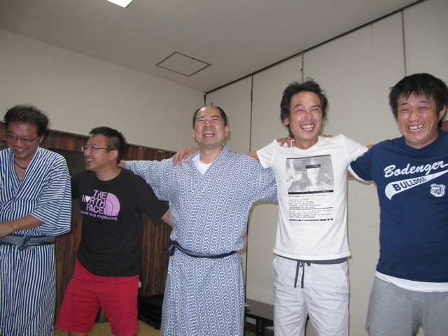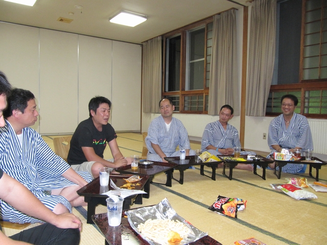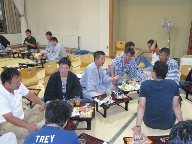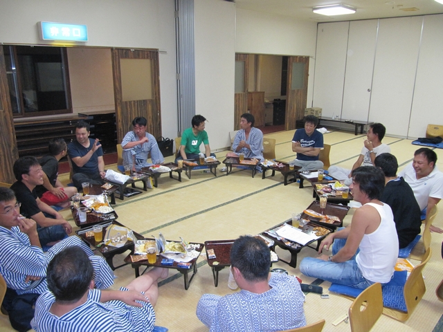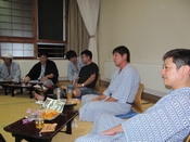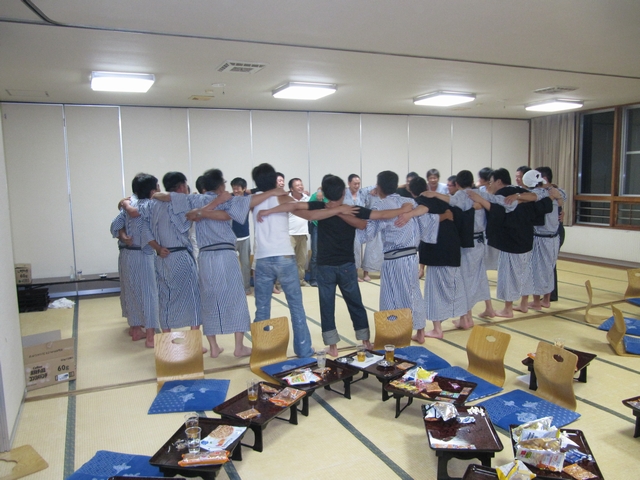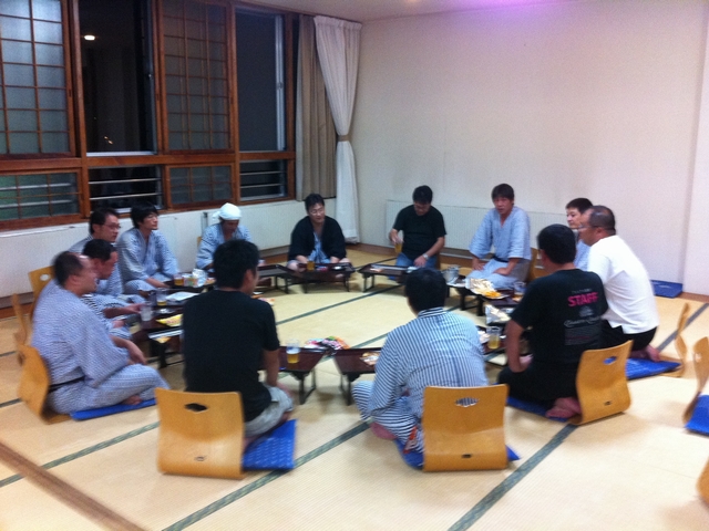 夕食、入浴で多少身体をリラックスさせたのち、研修2の「経営塾卓話会」を行い、多少のお酒を交えた中で、研修1を経て感じた日ごろ抱えている悩みやその解決策などを語り合い、今塾で立てる経営計画を現実のものとするために必要な心構えや動機を強めました。 経営塾卓話会のラストは、参加者全員で肩を組み合って、「のびゆく大地」を斉唱しました。経営者は孤独であるとよく言われていますが、この時間にはなんともいえない仲間との一体感を感じることができました。 |