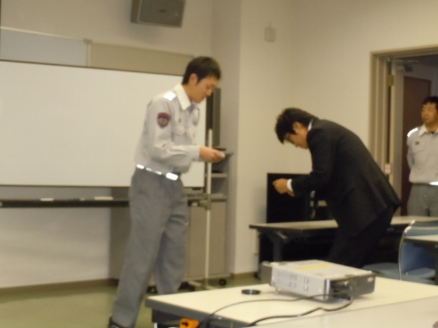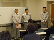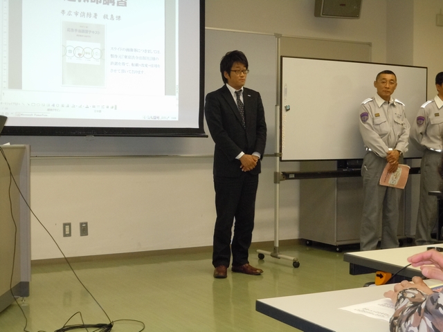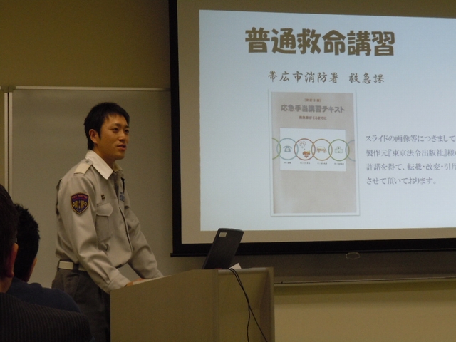 帯広消防署からは北村さん、富士田さん、小林さんの3名が就いてくれました。まず始めに小林さんの講師によるテキスト講習が30分ほどありました。テキストも5年に一度のペースで改訂があるようで、今回使ったテキストは改訂3版というテキストでした。後に行う実技講習に向けた内容をテキストに倣いながら丁寧にお教えくださいました。 |