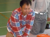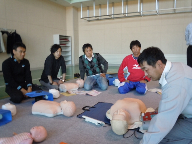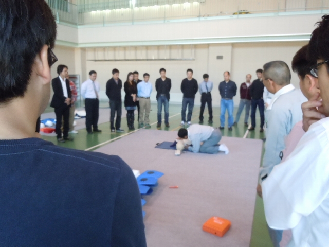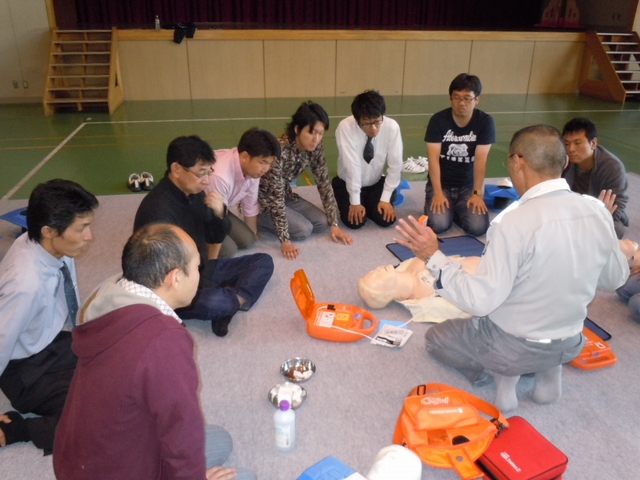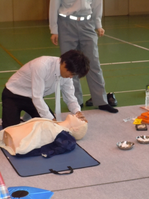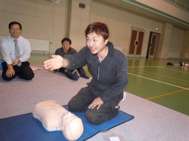 救命処置の手順として、「傷病者の反応確認」「助けを呼ぶ(119番通報・AED確保)」「気道の確保と呼吸の確認」「人口呼吸」「胸骨圧迫による心臓マッサージ」「AEDによる除細動処置」の実技を各々実践しました。初めは談笑していた各参加者も“いざ”という時を想定した実技に緊張感をもって、真剣に取り組んでいました。 |