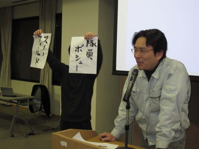 休憩を挟み最後は、エピソード顔写真合わせクイズ! 引き続き3チームに分かれ、司会者に読み上げられたエピソードを元に対象者の顔写真を探し出すゲーム。引き当てた写真に点数が有り10点や30点、果ては、1点に999点と参加者一同で一喜一憂し、会員の顔が楽しく覚えられる面白い試みでした。 |
