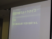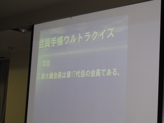 そして、次は「会員手帳ウルトラクイズ」 手帳から出される様々な問題に三役・理事たちも後半になるに従い苦悶の表情を浮かべる人がおりました。鶴・亀・兎と3チームに分かれてクイズ合戦の結果は、「兎」チームの勝利で幕を閉じました。 |