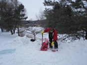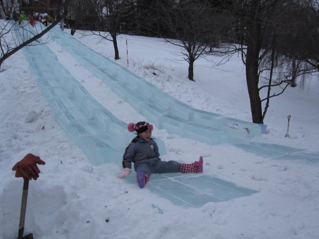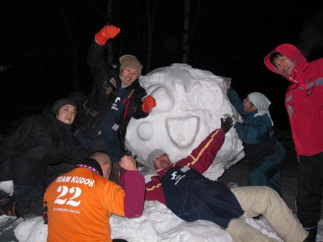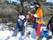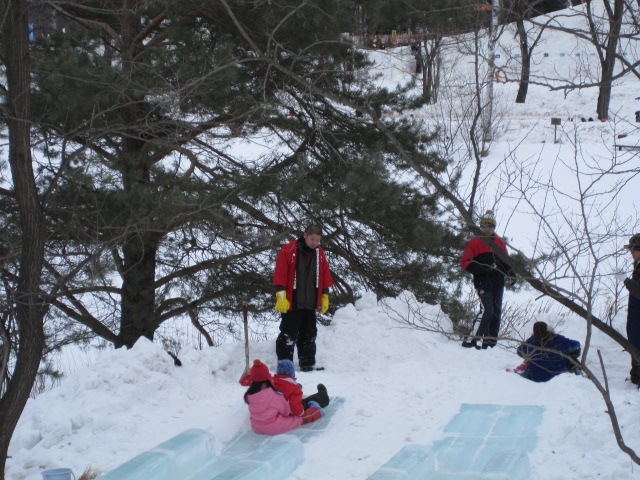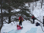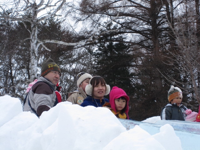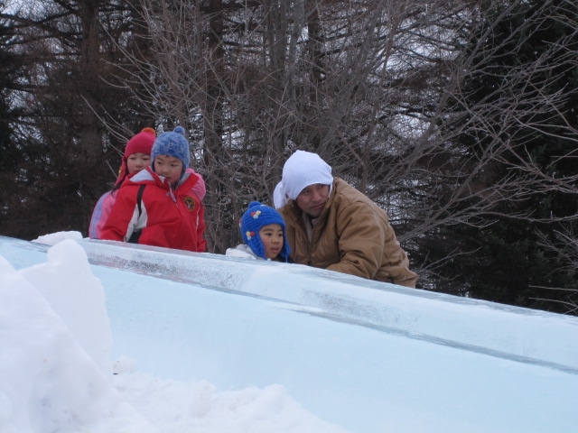 最初はおっかなびっくりの小さな子供たちも、2回3回と滑るうちに満面の笑顔に! 2人、3人と数珠繋ぎで滑ったり、隣同士速さの競争したり、思い思いの滑り方でジャンボスライダーを楽しんでます。 もちろんお父さんお母さん方も、子供に混じって楽しんでいましたよ。 子供たちの歓声を聞くと寒い中、忙しい中集まって製作したかいがあるものです。 |