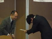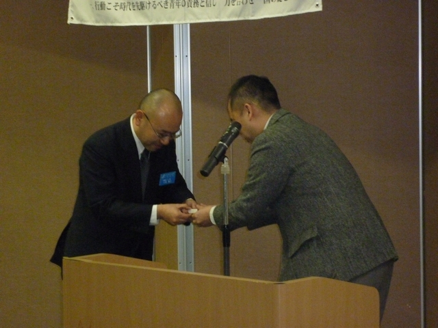 初めに、工藤会長より、この例会は少しでも早く次年度委員会に慣れて頂く目的で、次年度の委員会配属が発表になるのと同時に、第1回委員会が開催されますので、短い時間ではありますが有意義な時間を過ごして下さい。と御挨拶を頂き、その後新入会員の小林善之君への徽章授与が行われました。 |