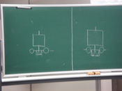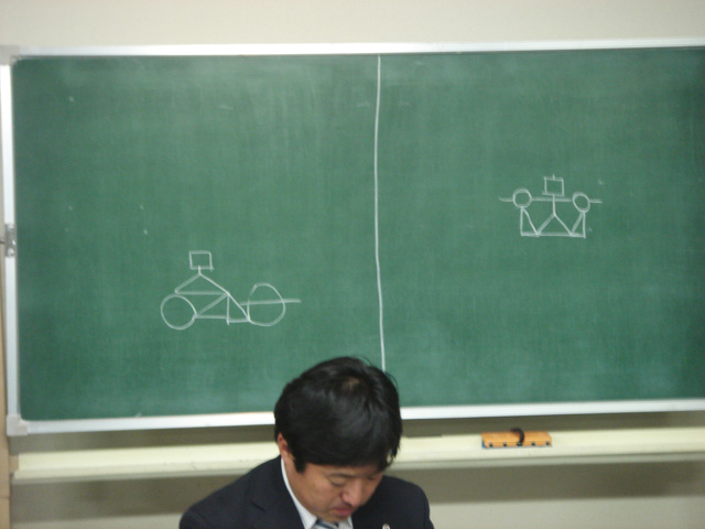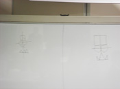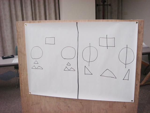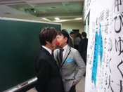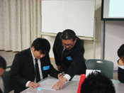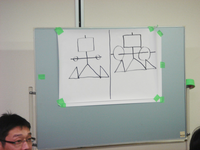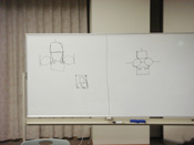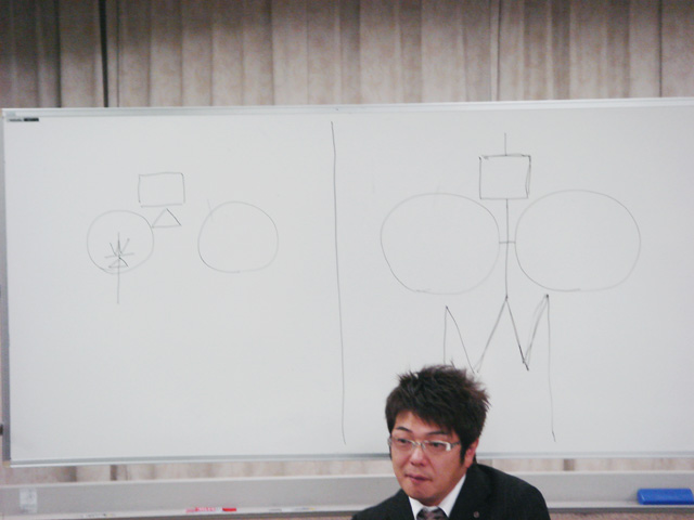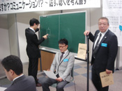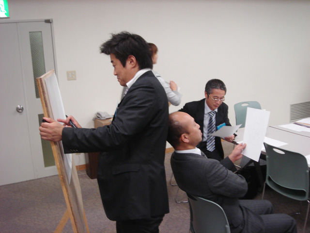 エクササイズⅡはAさん役とBさん役の2人で行う伝言ゲーム。お互いに背中合わせになり1回目はAさんはBさんに絵を見せないでその絵の図形を伝え、BさんはAさんの指示を聞き返したり質問をしてはいけない約束で図形を書き、2回目は、BさんはAさんに質問をしながら図形を書きました。1回目は相手の理解度を確認できず、2回目は電話でのコミュニケーションに近い形なので、1回目よりは2回目のほうが指示に近い図形をかけるペアがいました。 |