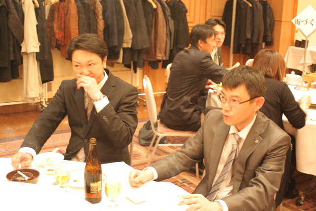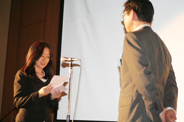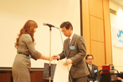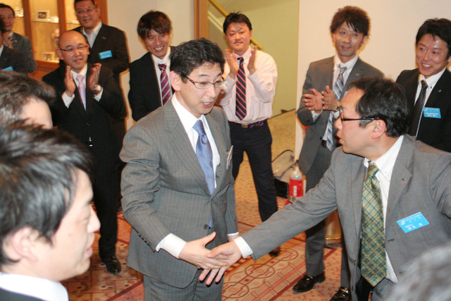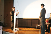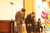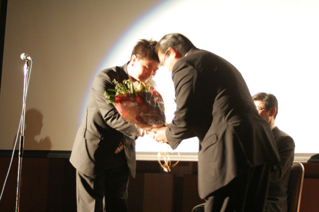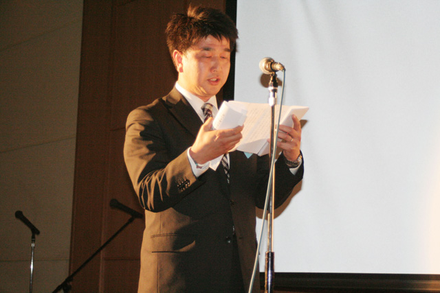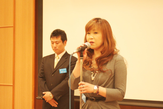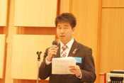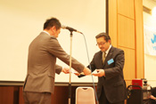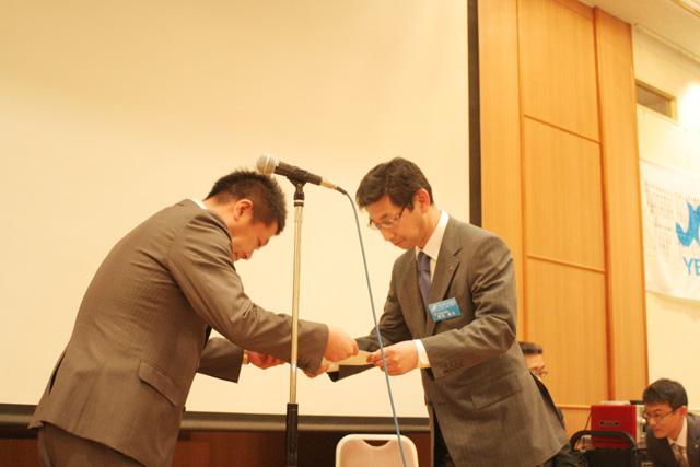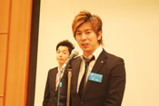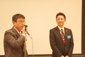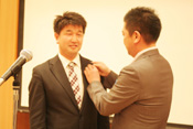 1年間の振り返りの後には、平成24年度から平成25年度への引継ぎ式が行なわれ、望月会長から朴会長予定者へ会長徽章が渡されました。