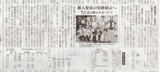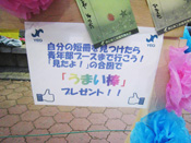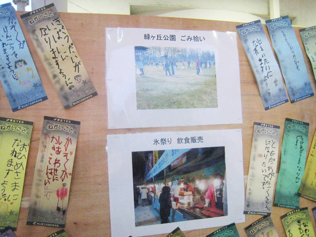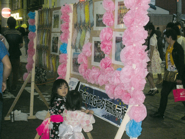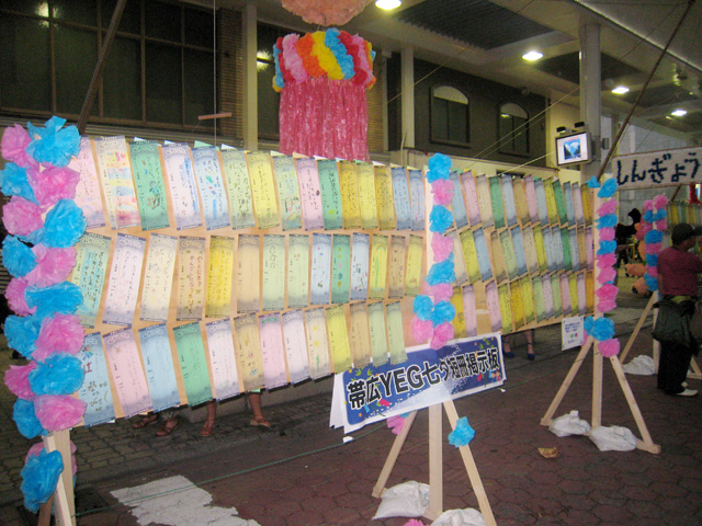 平成25年8月4日(日)〜8月7日(水)にかけて、広小路商店街で総務広報委員会主催事業「短冊に認知度UPの願いを込めて」が開催されました。 8月4日〜7日にかけて開催される七夕祭りにおいて、帯広市内の小学校1年生(約1400名)に短冊に願い事を書いてもらい、それを祭りの会場に展示しました。親子連れで、子供の書いた願い事を見に来ていただき、同時に帯広商工会議所青年部の名前や活動を知っていただく趣旨で実施しました。 |