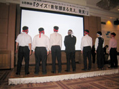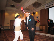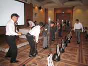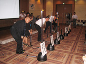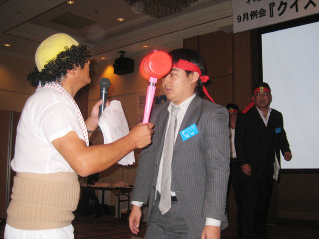3番目のゲームは、「クイズわっかるかな〜めくってPON」です。メンバーの名前と会社名が少しずつ見えてきて、わかった人は自転車の空気入れを使ってピンポン玉を筒から出したら回答できるゲームです。 |