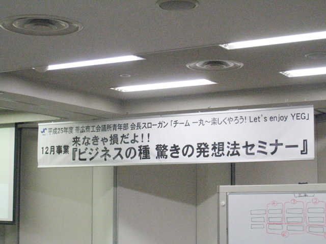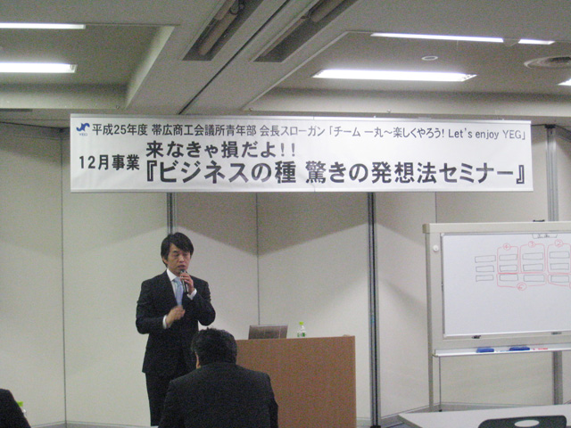 平成25年12月5日(木)帯広商工会議所6階大会議室でビジネスサポート委員会による研修事業「来なきゃ損だよ!! ビジネスの種 驚きの発想法セミナー」が開催されました。 |