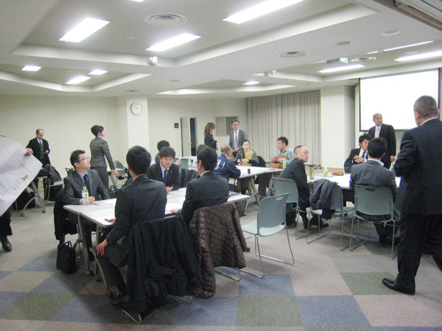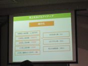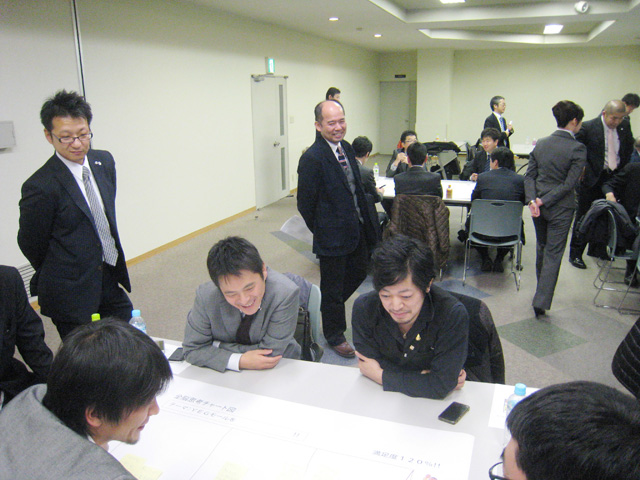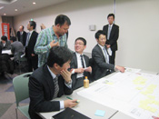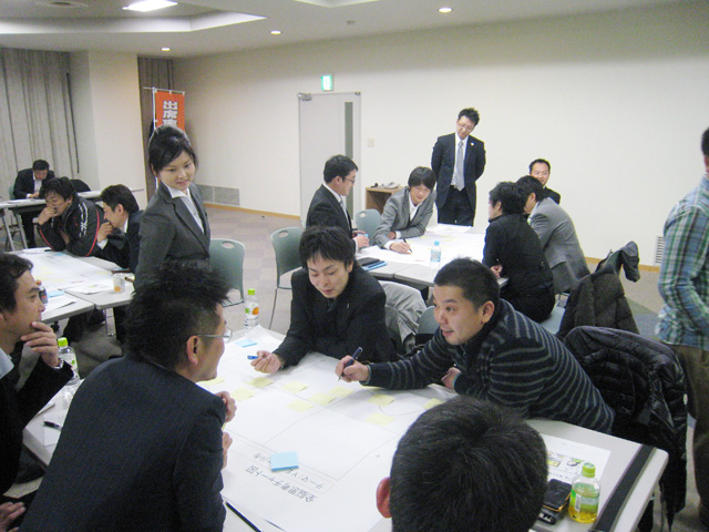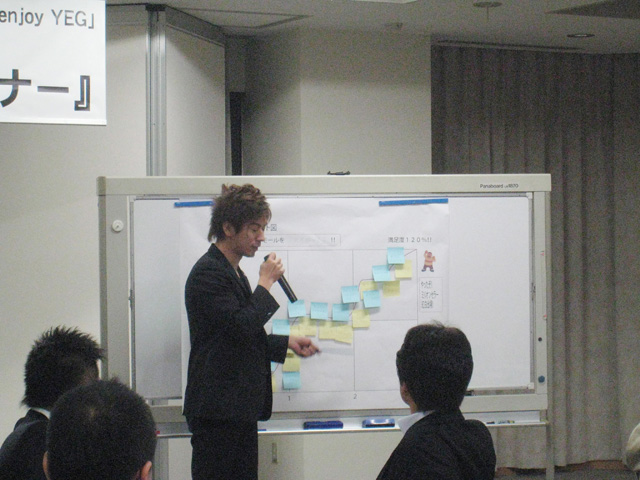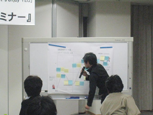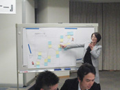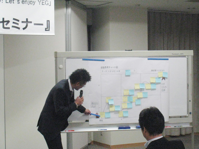 最後に、各グループの代表者から、グループワークのまとめの発表がありました。各グループ共、ジャイアンが歌手で成功する、というおもしろいお題から、YEGモールを日本一のショッピングサイトにする等の、難しいお題を一つに考えての発想であり、とてもやわらい頭で出てきた意見・アイディアにあふれていました。 |