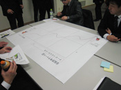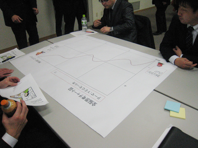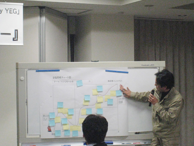 次に、「YEGモールを・・・」というお題で、各グループ最終的にYEGモールでどうなりたいか、の目標を設定して、ジャイアンのサクセスストーリーにあわせていろいろな発想を自由に模造紙に貼り付けていきました。 |
